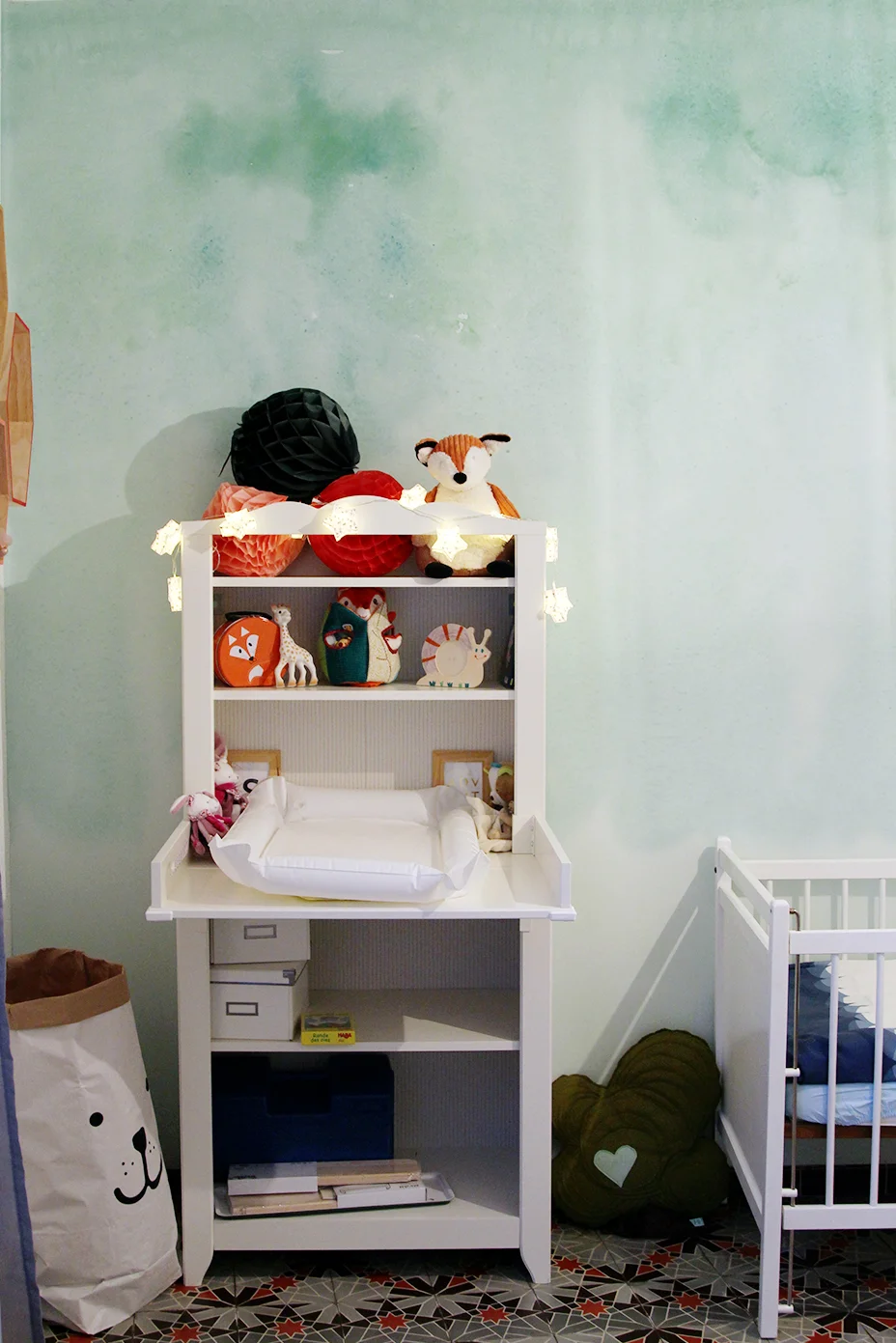 Pour les murs, un coup de peinture blanche et, surtout, une magnifique toile textile de chez Scenolia façon aquarelle vient habiller une partie du mur! Je suis complètement fan : en effet, les murs de notre maison sont crépis et il nous est impossible d'ajouter de la couleur. La toile textile était alors un super compromis pour apporter de la couleur dans la chambre de Salomé!